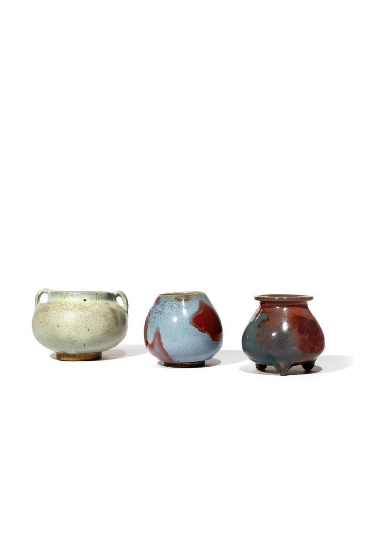 One an ovoid vase, another a pear-shaped tripod incense burner, the third a two-handled jar, decorated in glazes of grey, red and lavender blue, 13.5cm. (3)