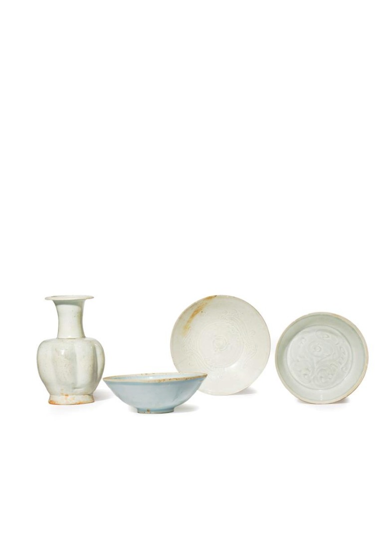 FOUR CHINESE QINGBAI ITEMS SONG DYNASTY 960-1279 AD Comprising a lobed vase and three dishes