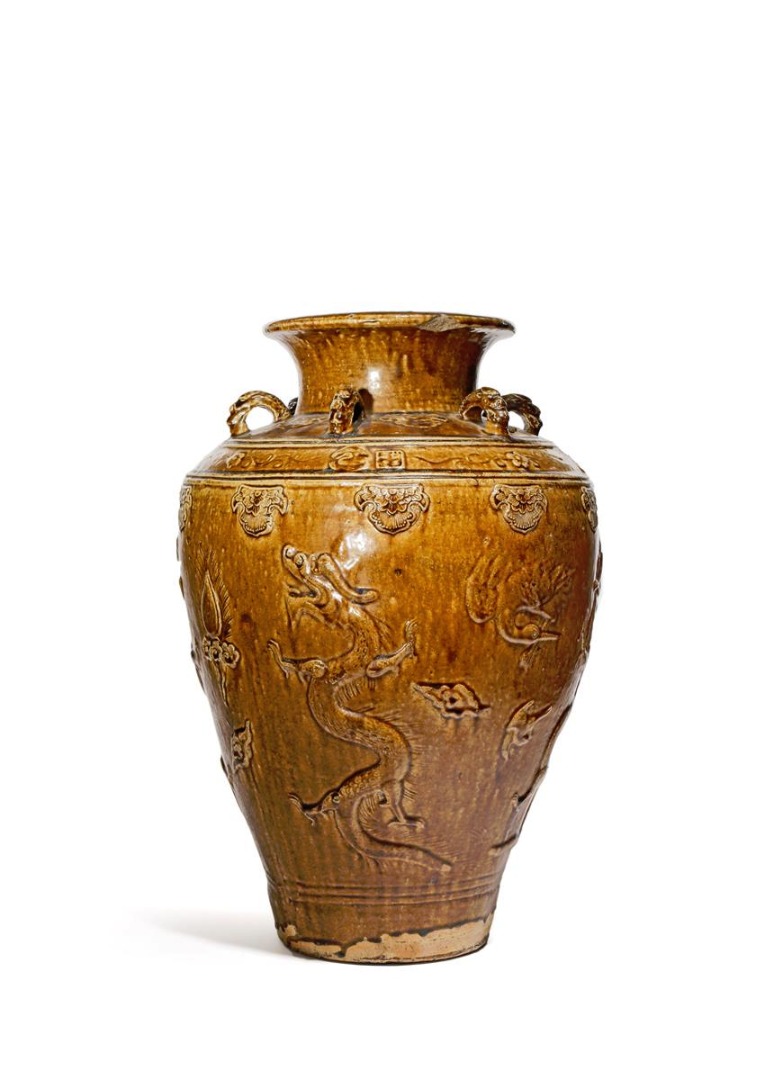 A LARGE CHINESE BROWN GLAZED MARTABAN JAR MING DYNASTY The tapering ovoid body decorated in...