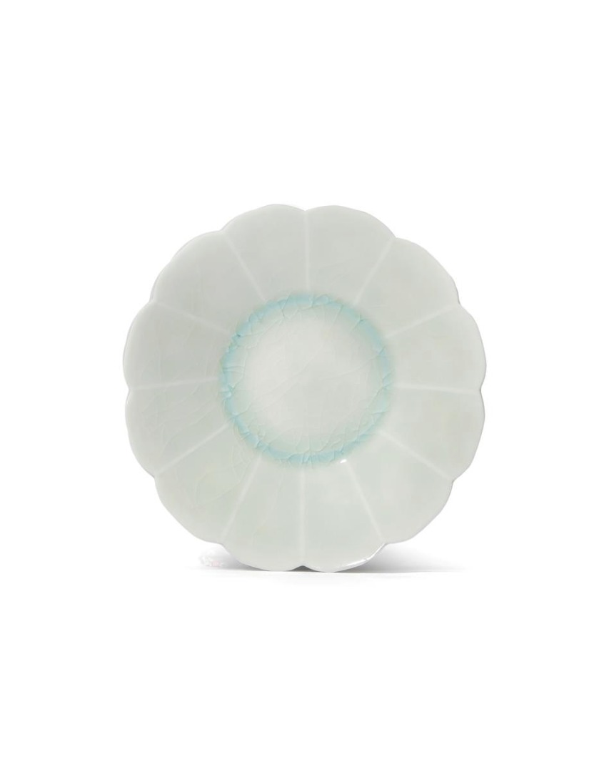 With lobed petals extending from the centre, decorated with a pale blue translucent glaze, 10.5cm.