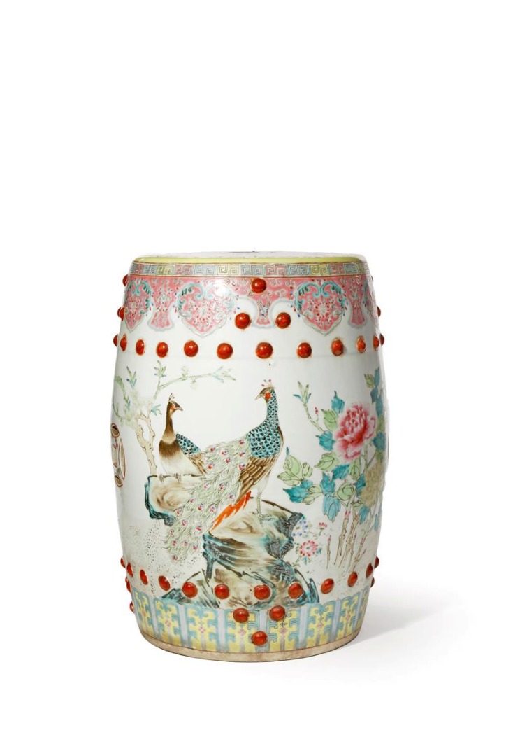 A CHINESE FAMILLE ROSE GARDEN SEAT REPUBLIC PERIOD The barrel-shaped body moulded with studs