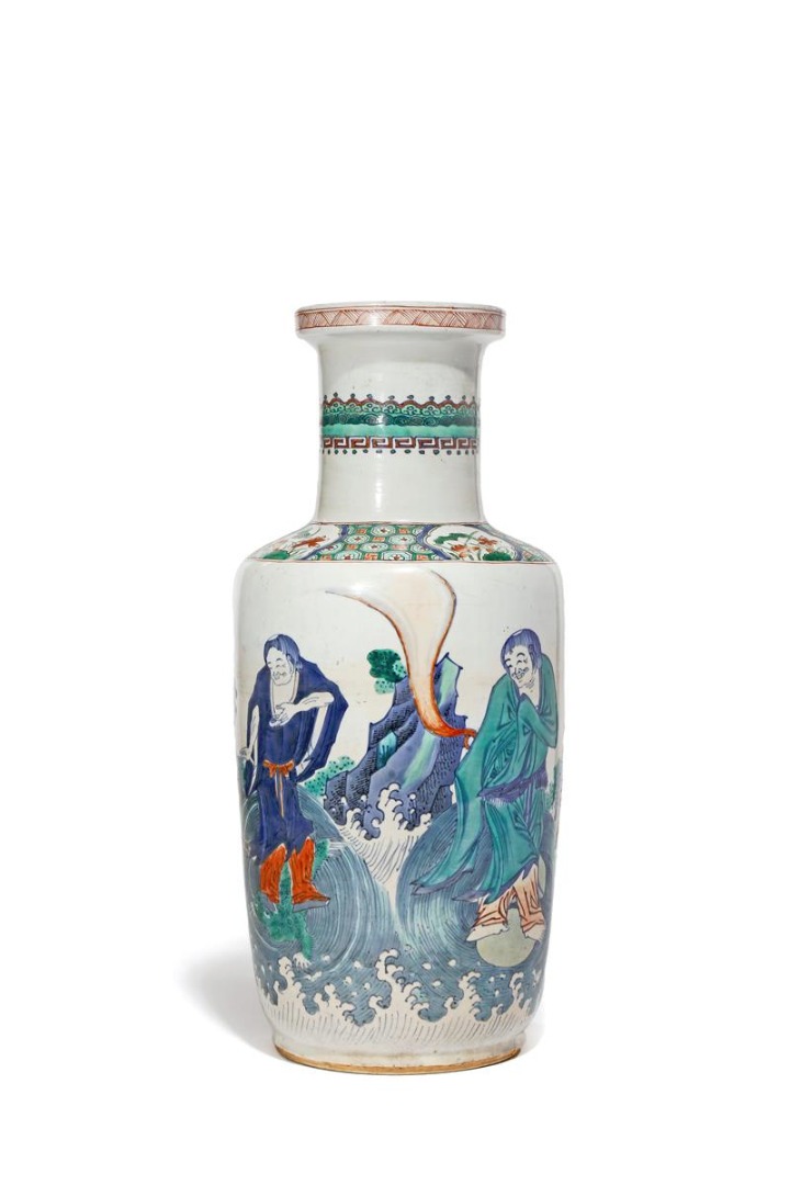 The cylindrical body painted with four Immortals riding on the backs of mythical creatures amongst crashing waves and rockwork, the shoulder with a band of lotus panels on a cell ground beneath concentric ruyi and key fret bands, 45.2cm.
