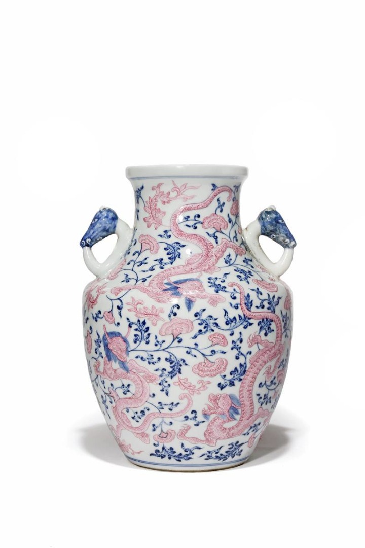 Painted with scrolling lingzhi fungi and enamelled in pink with six sinuous dragons and further foliage, the shoulder with animal mask handles, the base with a faint six character Daoguang mark which reads Daoguang geng xu nian zhi, corresponding to the year 1850, 23.5cm.