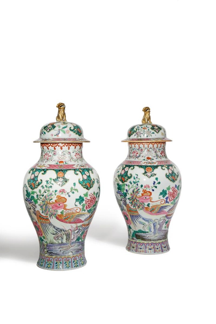 Each brightly enamelled with a pair of colourful phoenix, with other pairs of birds amongst rocks and flowering peony, all within bands of lappets and ruyi-shaped foliate borders, the neck with a lotus scroll, the covers with a Buddhist lion dog finial, 48.2cm. (4)