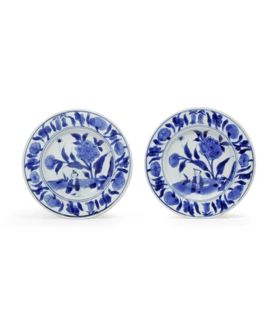 A PAIR OF CHINESE BLUE AND WHITE DISHES MID-17TH CENTURY Each painted with a boy sitting beneath...