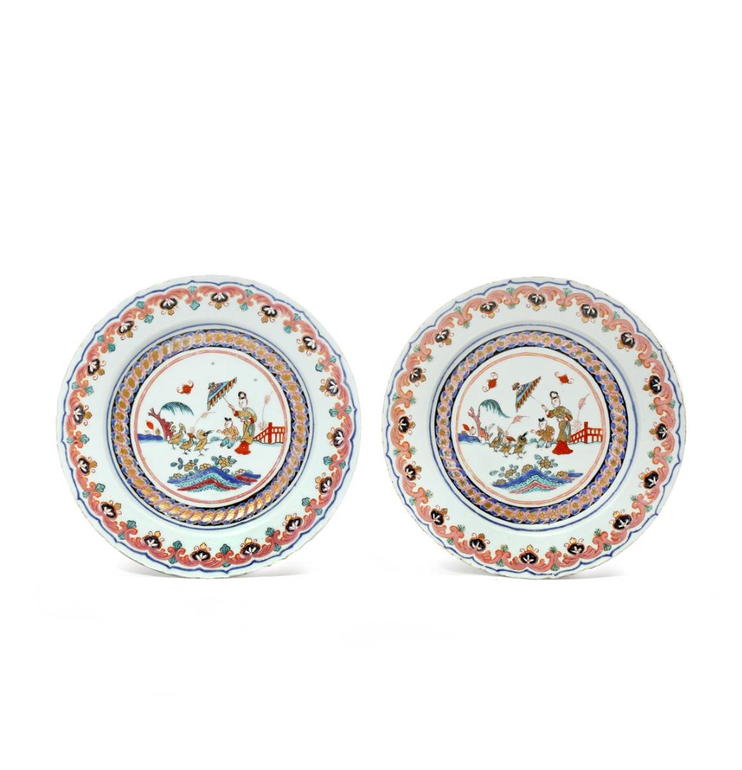 Painted with a central design after the Cornelius Pronk scene, La Dame au Parasol, the rims with scalloped foliate borders, 26.5cm. (2)
