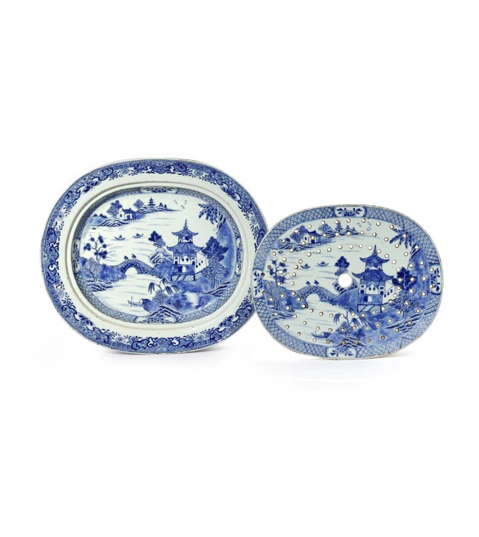 A LARGE CHINESE BLUE AND WHITE OVAL DISH AND STRAINER 18TH CENTURY Painted with a mountainous...