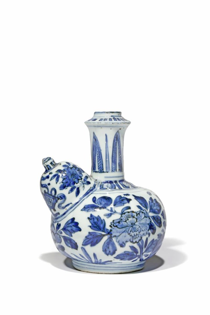 A CHINESE BLUE AND WHITE KENDI 17TH CENTURY The ovoid body painted with a single bird amonst...