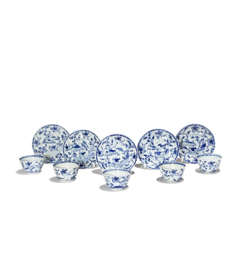A SET OF FIVE CHINESE BLUE AND WHITE MINIATURE TEA BOWLS AND SAUCERS KANGXI 1662-1722 Painted...