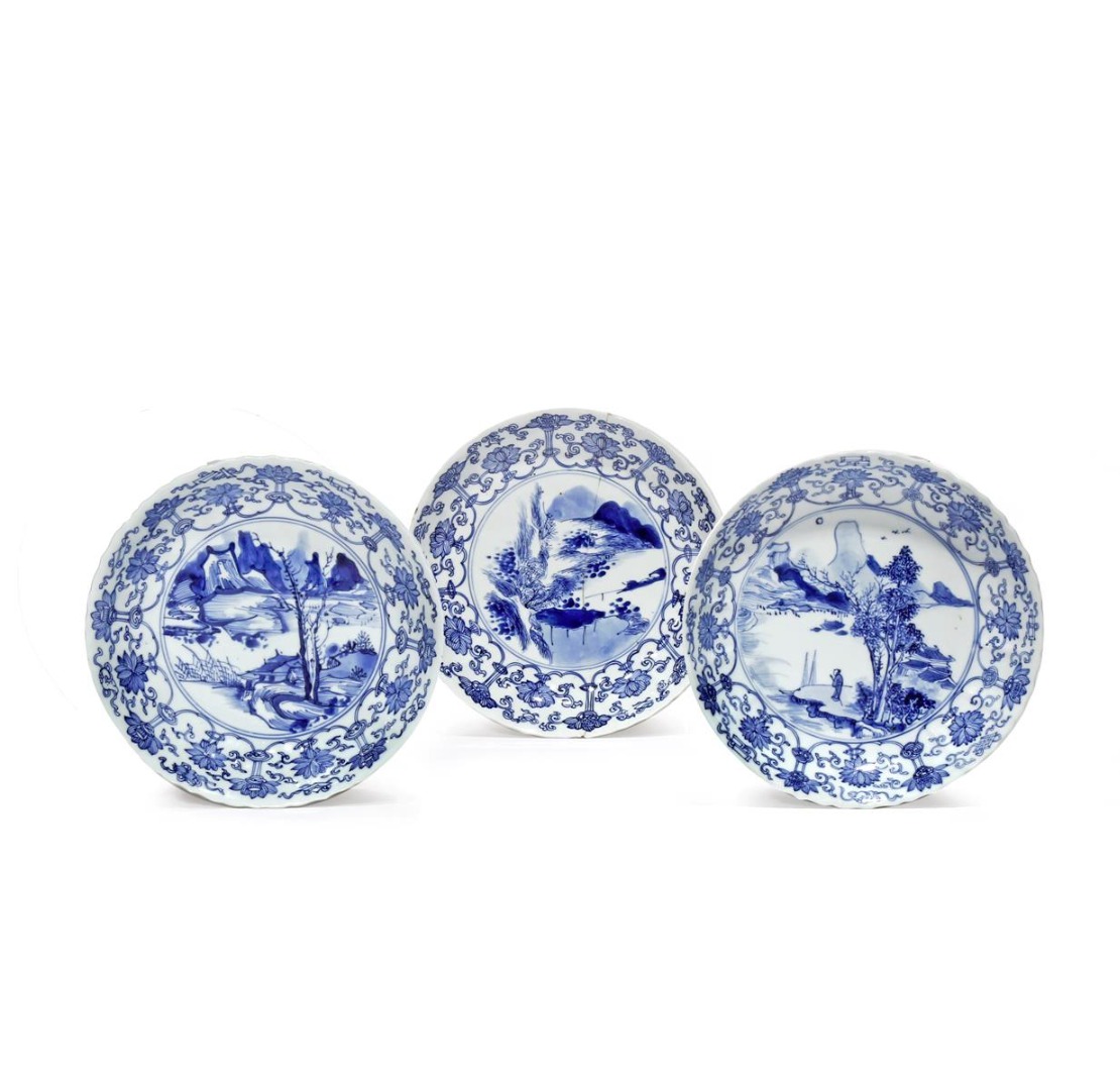 THREE CHINESE BLUE AND WHITE 'MASTER OF THE ROCKS' DISHES KANGXI 1662-1722 Each painted to the...