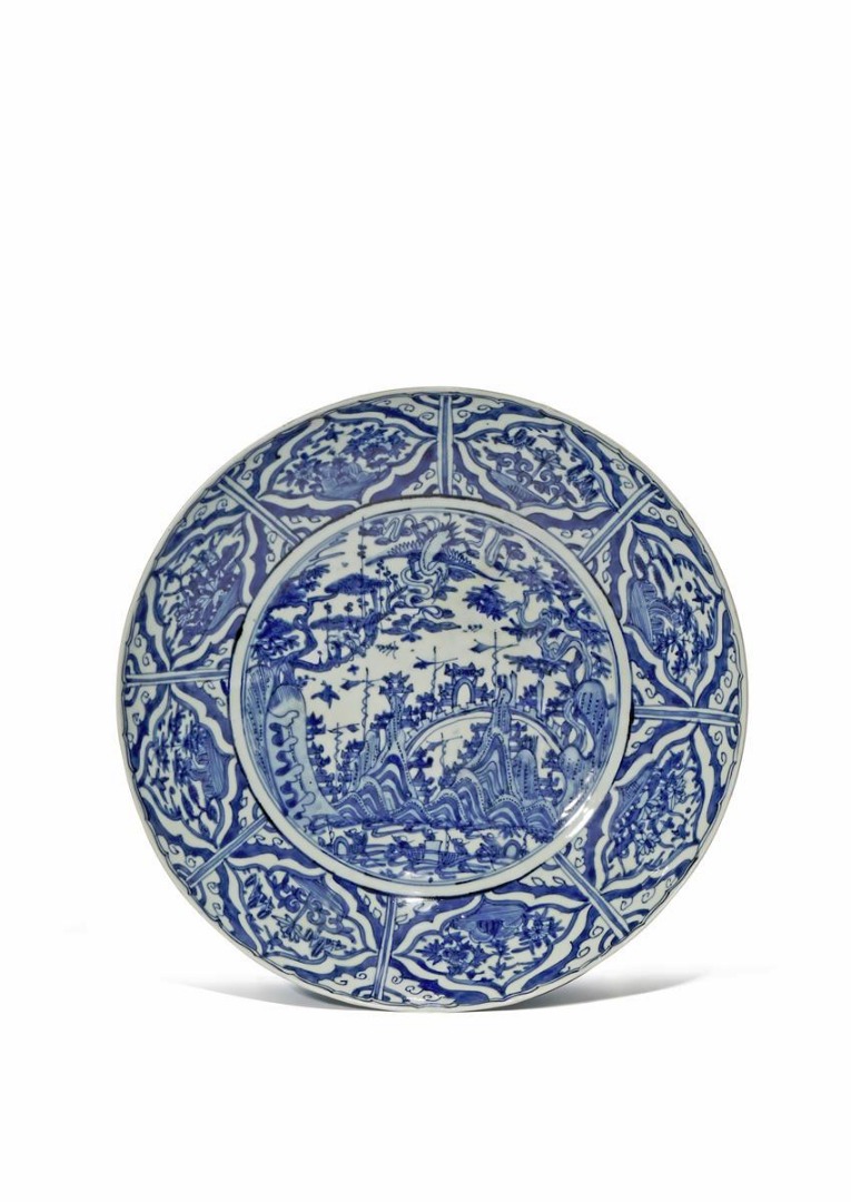 A LARGE CHINESE SWATOW BLUE AND WHITE DISH LATE MING DYNASTY Painted with a circular panel...