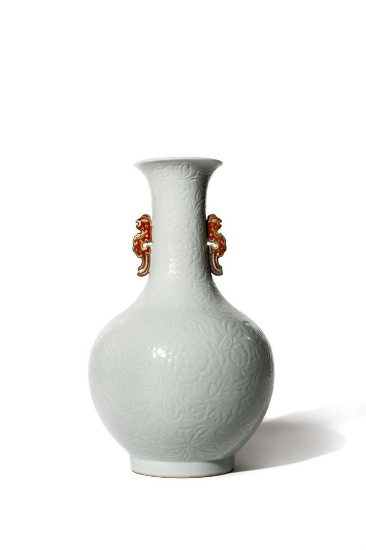 A CHINESE WHITE GLAZED BOTTLE VASE MODERN The pear-shaped body moulded with many peony blooms and...