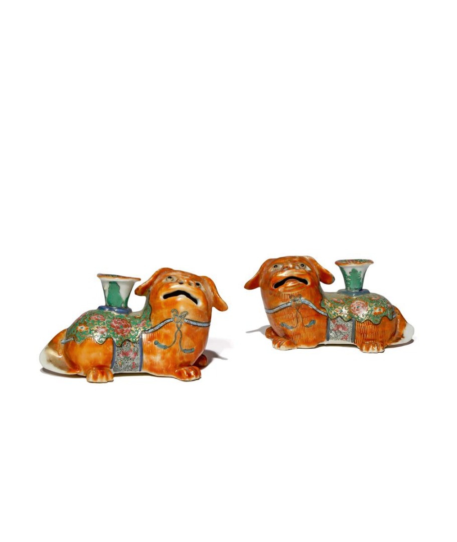 A PAIR OF CHINESE CANTON FAMILLE ROSE CANDLESTICK HOLDERS 19TH CENTURY Modelled as recumbent...