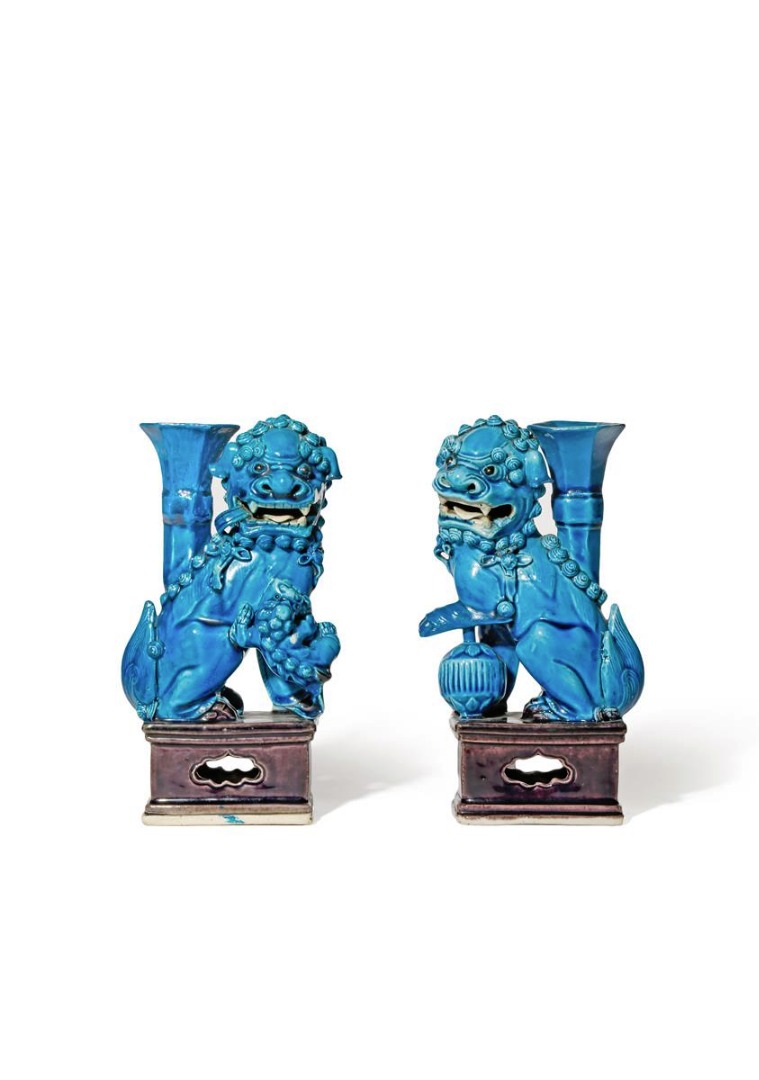 A PAIR OF CHINESE MODELS OF BUDDHIST LION DOGS KANGXI 1662-1722 The male with its forepaw resting...