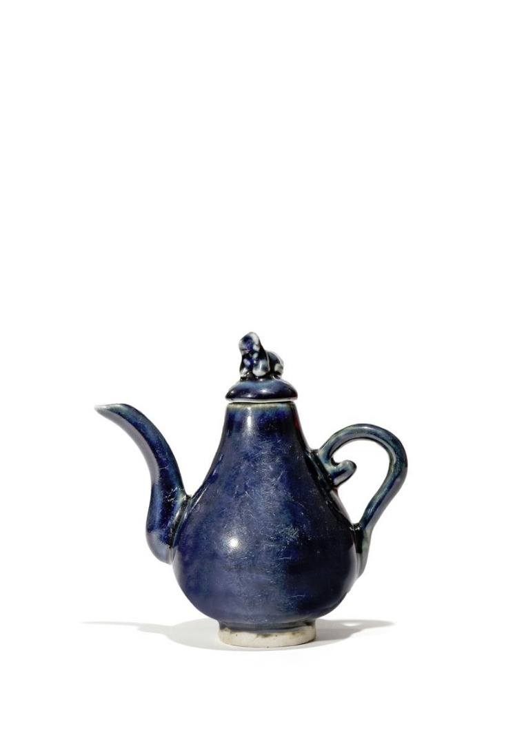 The pear-shaped body raised on a short flaring foot, the domed cover surmounted by a Buddhist lion dog, decorated all over with a deep blue glaze, 13cm. (2)