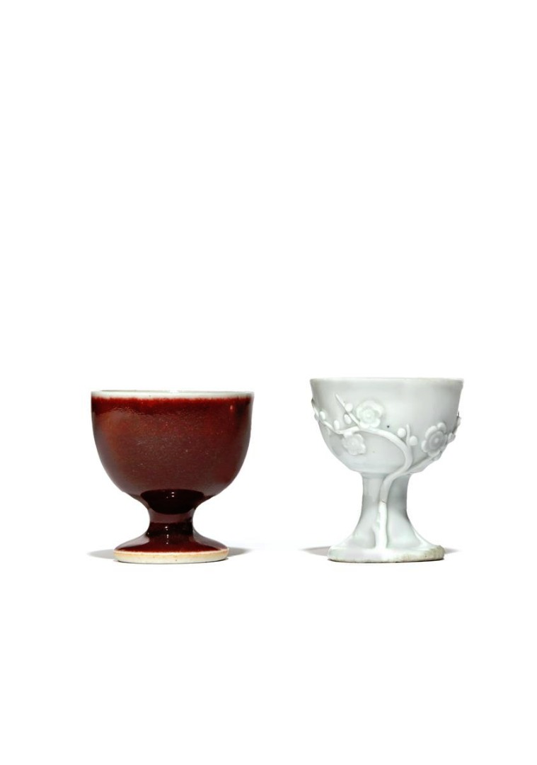 Each with a U-shaped body raised on a flaring foot, one blanc de Chine, moulded to the exterior with prunus, the other decorated with a sang de boeuf glaze, the former with a paper label for Robert McPherson, 6.3cm. (2)