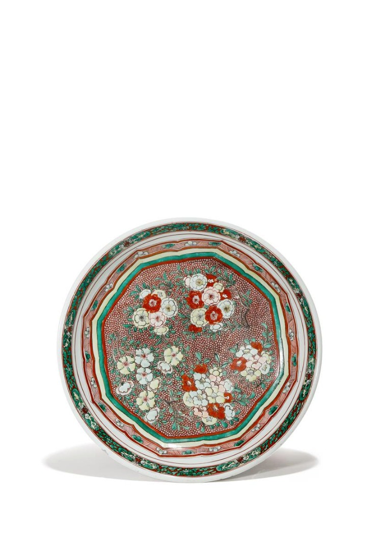 A CHINESE FAMILLE VERTE DISH KANGXI 1662-1722 With a central shaped cartouche containing flower...
