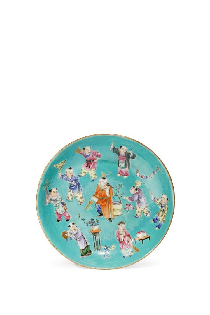 Colourfully painted to the well with nine boys, each standing and with various attributes including vases, ruyi sceptres and flower stems, all reserved on a turquoise ground, the reverse with a further seven boys, the base with a six character Jiaqing mark, 23.2cm.