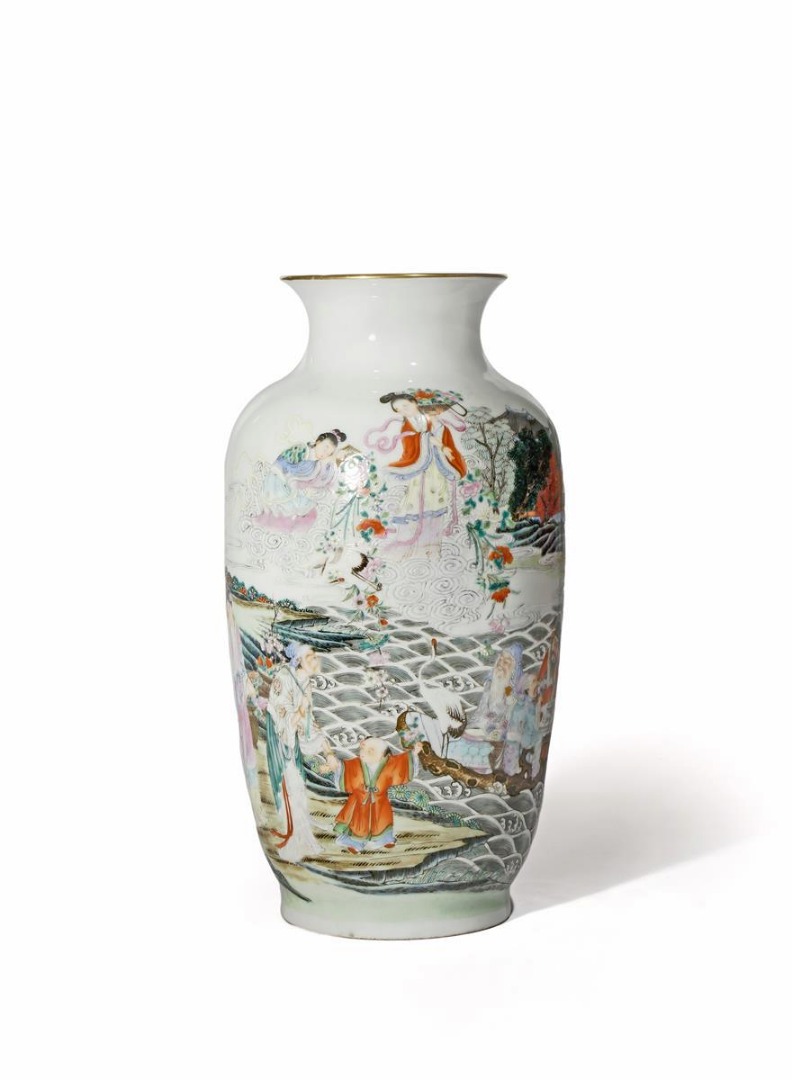 A CHINESE FAMILLE ROSE OVOID VASE 20TH CENTURY Brightly painted with Immortals in a boat beneath...