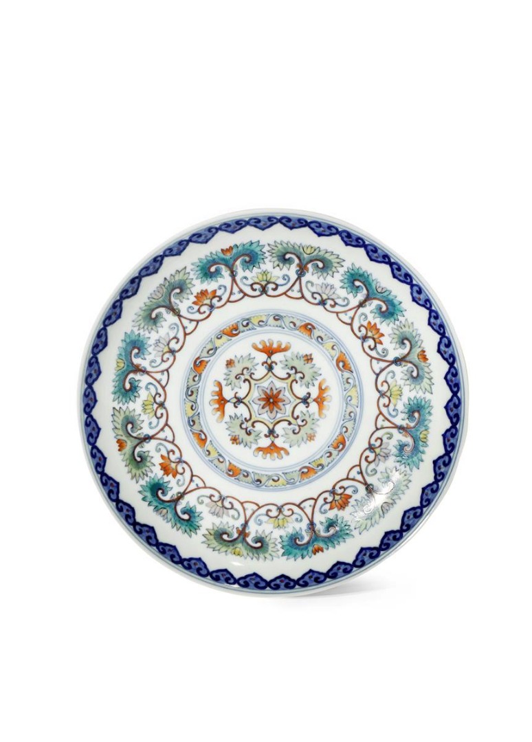 A CHINESE DOUCAI DISH PROBABLY LATE QING DYNASTY Painted with concentric bands of leafy foliate...