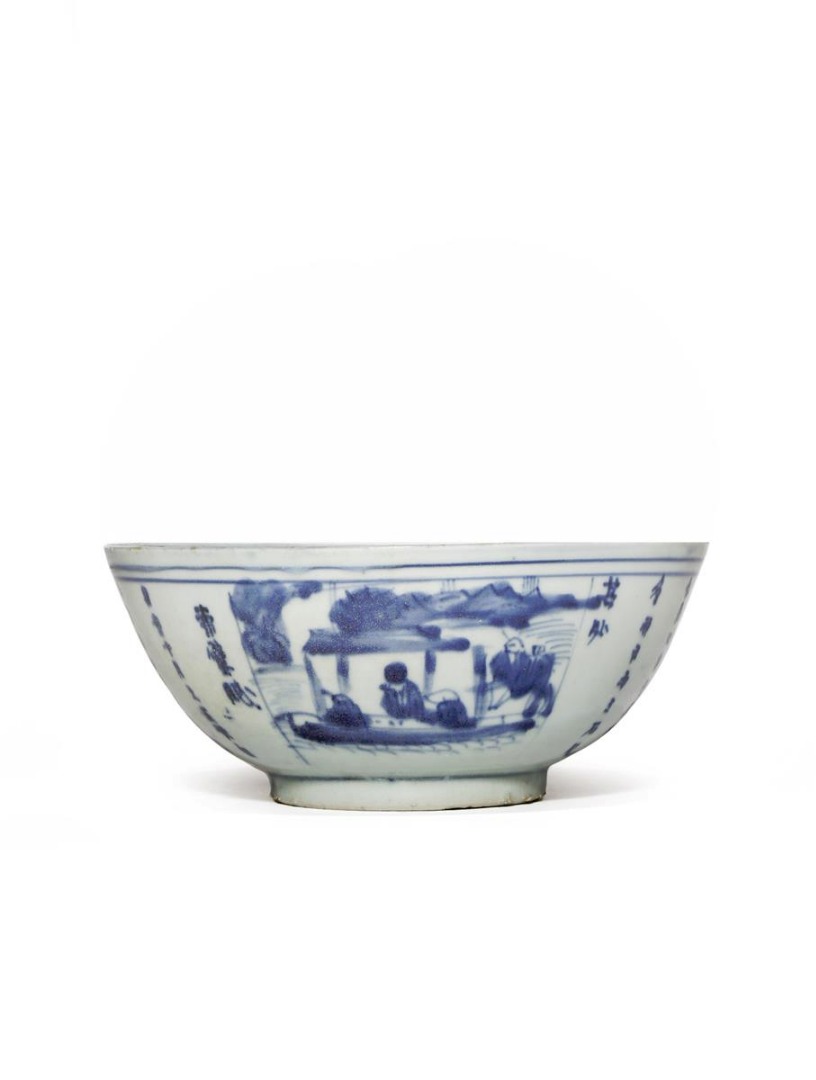 A CHINESE BLUE AND WHITE BOWL FROM THE HATCHER CARGO C.1640 Painted to the exterior with a panel...