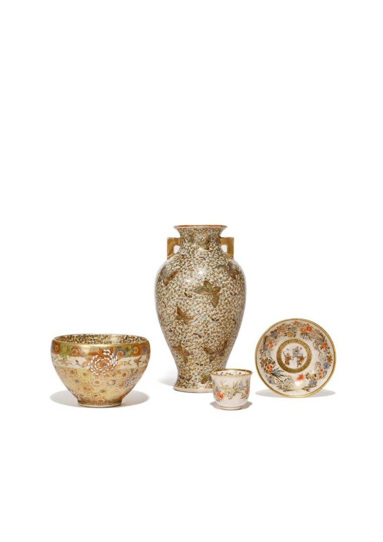 Decorated with many butterflies, the base signed Satsuma Hododa, together with a small bowl, the interior painted with further butterflies and the exterior with birds and flowers, inscribed Hasegawa zo, and a miniature cup and saucer with boys and flowers, signed Kizan, 17.5cm. (4)