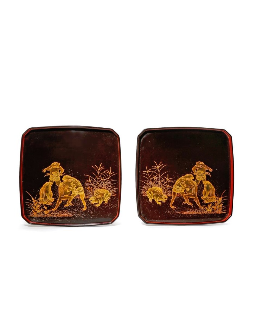 Each with chamfered corners, decorated with sumo wresting frogs amongst grasses, the inner rims lacquered red, 30cm. (2)