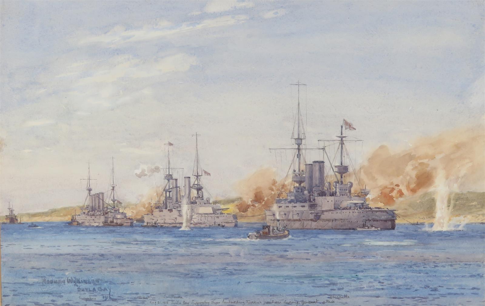A pair, both signed, titled Suvla Bay and dated 1915, also inscribed in pencil with details of the battle and names of the ships