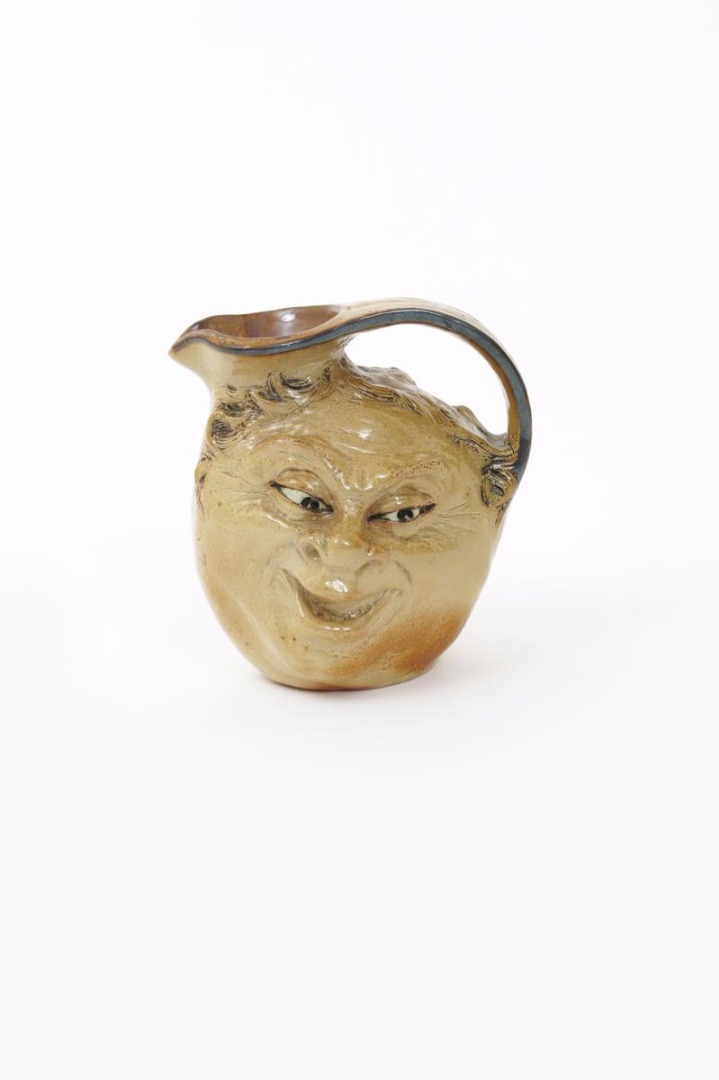 A Martin Brothers stoneware face jug, dated 1910, modelled with smiling face to one side, the other side pursing his lips, glazed brown on a buff ground, highlighted in white incised 5-1910 Martin Bros London & Southall, 15.5cm. high