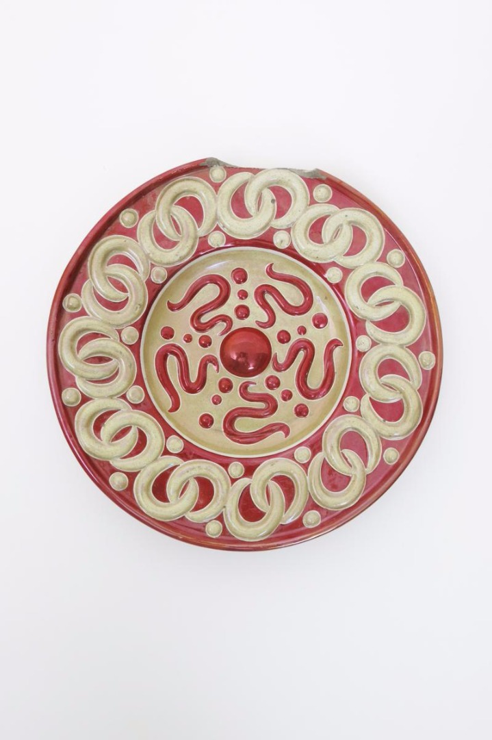 A William De Morgan Farini plate, moulded in low relief with inter-linking circle border, the well with similar raised decoration, glazed in ruby and sand lustre impressed tulip mark, chipped section to rim, 28.5cm. diam.