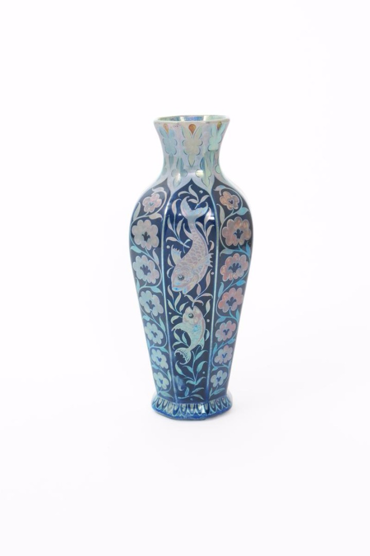 A Good William De Morgan Sunset and Moonlight Suite vase by Fred Passenger, shouldered octagonal section, painted with columns of alternating scaly fish amongst waterweed and flowers, between stylised foliate bands, in golden lustre on a midnight blue lustre ground painted FP monogram 25.5cm. high