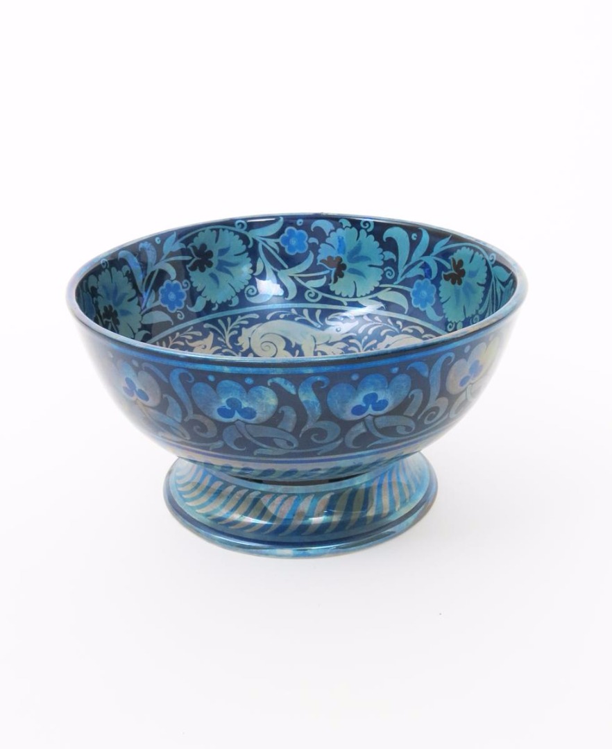 A William De Morgan Sunset and Moonlight pedestal bowl by Fred Passenger, the well painted with a mythical crested bird inside a border of clawed creatures on a scrolled foliate ground, the rim a border of carnation, the exterior borders of flowers and foliage in blue and sand lustre painted FP monogram, paper collector's label, 22cm. diam.