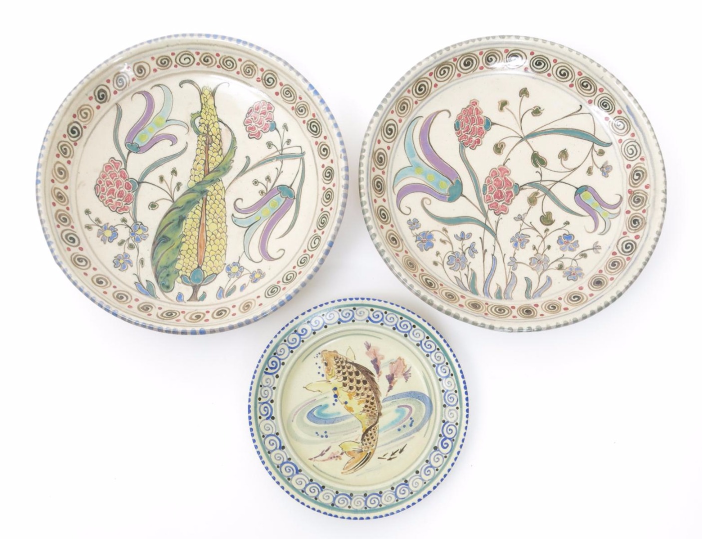 A pair of Collard Honiton Pottery chargers by Frederick Braddon, painted with stylised flowers and foliage in colours on a cream ground, and a smaller Collard Honiton plate painted with a scaly fish impressed marks, 36cm. diam. (3)