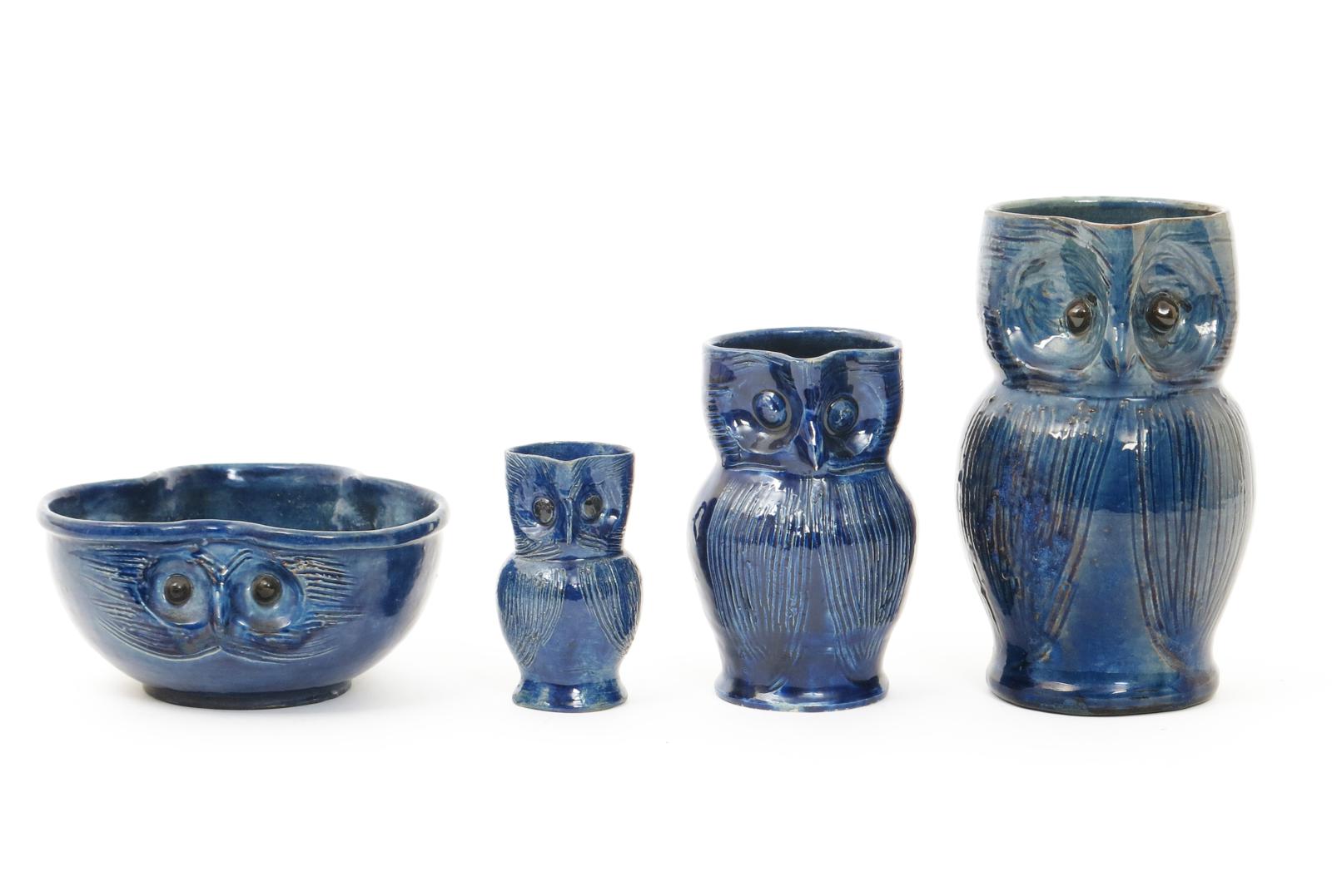 A composite set of three Farnham Pottery graduated Owl jugs, each with incised details, glazed blue and a Farnham Pottery Owl bowl, unsigned, 17.5cm. high