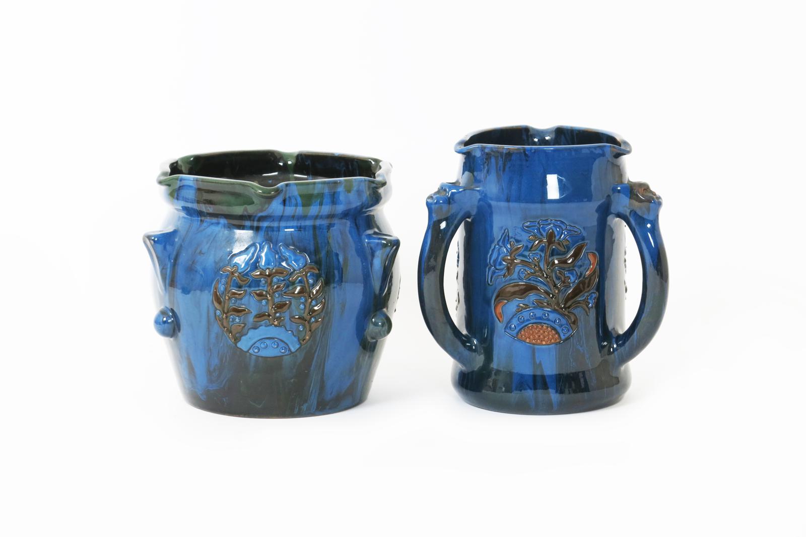 A Sunflower Pottery tyg by Sir Edmund Elton, swollen cylindrical form with pinched rim, the handles with mask terminals, slip applied with panels of flowers and foliage in shades of blue and brown on a streaked blue ground, and another Sunflower Pottery vase by Sir Edmund Elton Painted Elton mark, 21.5cm. high (2)