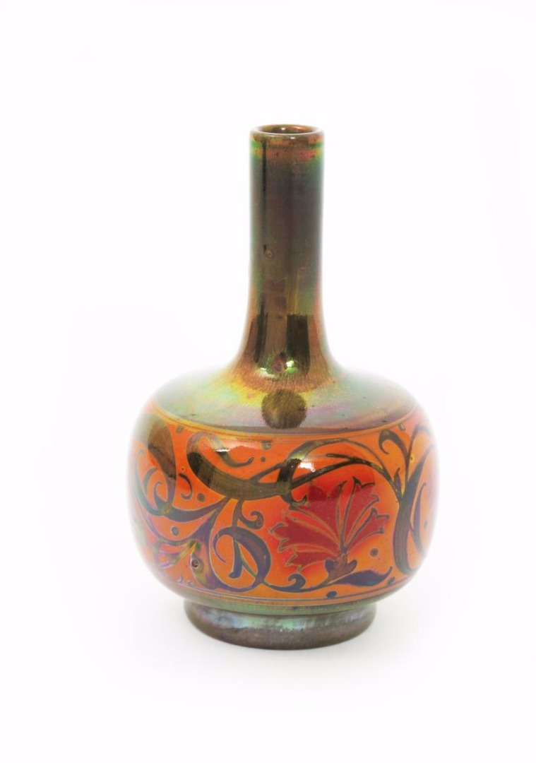 A Pilkington's Lancastrian Pottery vase by William S Mycock, shouldered cylindrical body with cylindrical neck, painted with a band of scrolling carnations in ruby and copper lustre on orange ground, the neck and base in copper lustre, impressed marks, painted artists monogram, 13cm. high