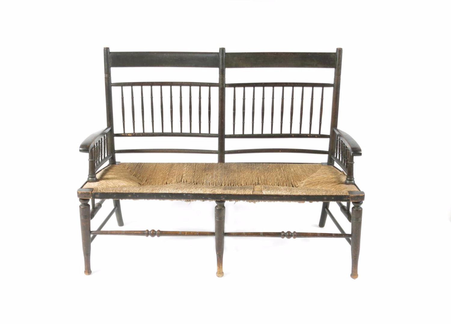 An ebonised wood 'Sussex' settle, in the manner of Morris & Co, with turned ebonised wood spindle back and arms, strung seat 114cm. wide.