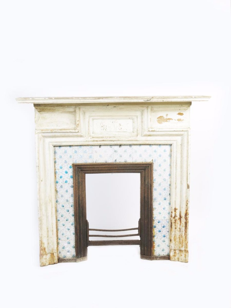 A Thomas Elsley cast iron and painted wood fireplace set with Morris & Co Swan tiles