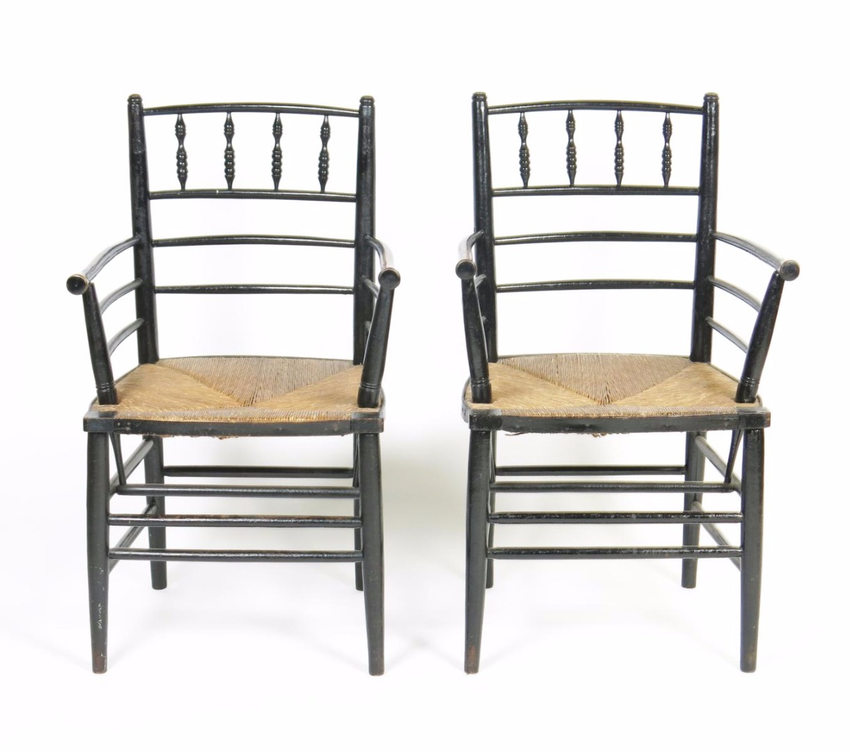 A pair of ebonised wood Sussex armchairs, possibly retailed by Liberty & Co, with turned bobbin backs, rush seat, stamped 45040 and 45672, 90.5cm. high (2)