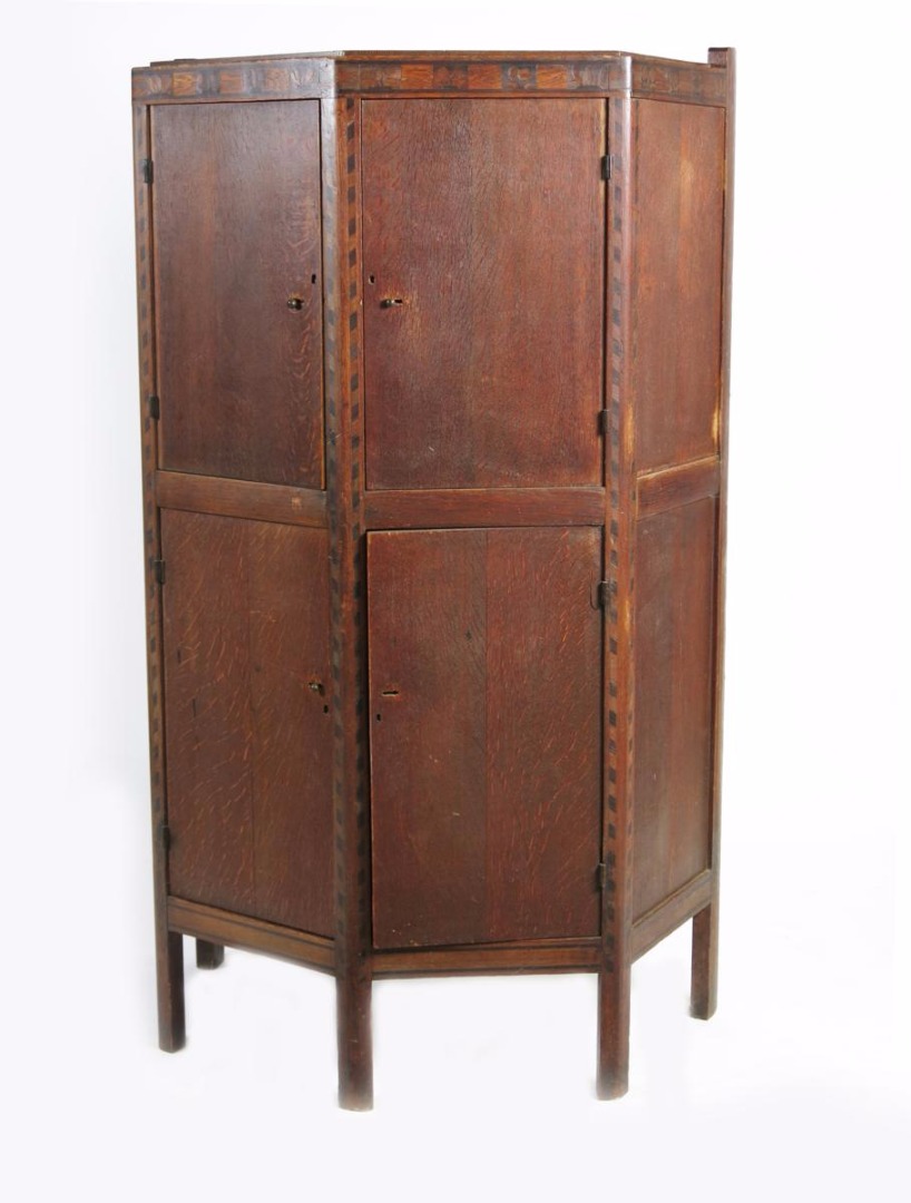 An oak cupboard by Sidney Barnsley, with angled sides and front, four hinged cupboard doors, the frame inset with columns chevrons and a border of inlaid flower panels in holly and ebony, on five chamfered legs, the interior with shelves, painted red, later alterations, 153cm. high, 90cm wide, 53cm deep.