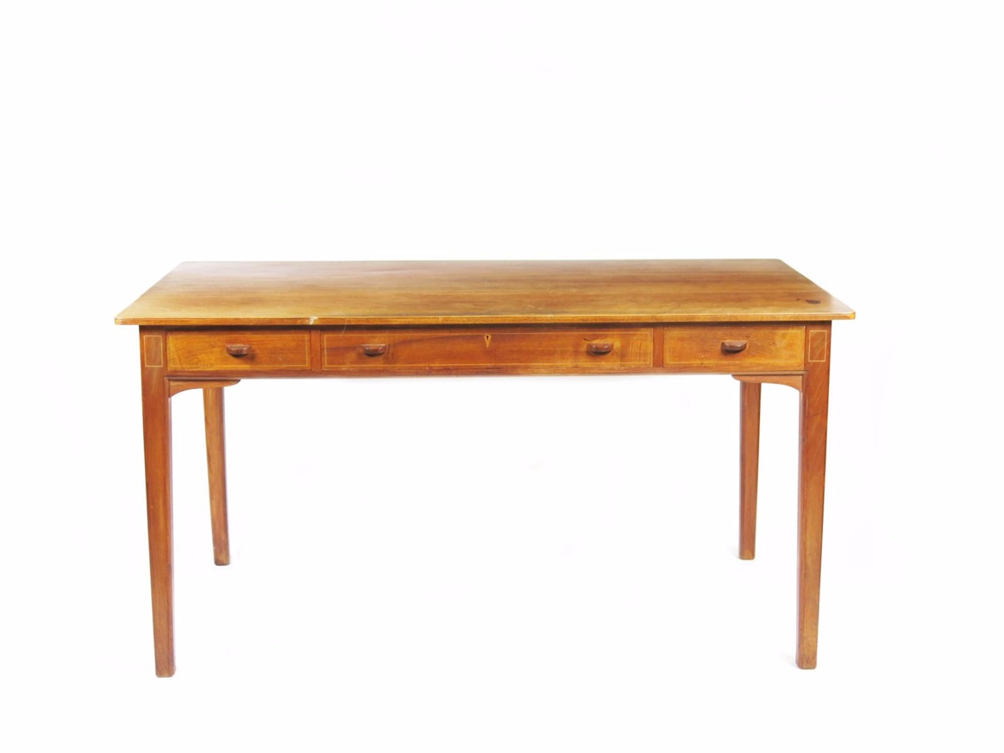 A Barnsley Workshops walnut desk, the rectangular top on tapering legs, the top set with three drawers, inlaid fruitwood border, 153 x 83cm.