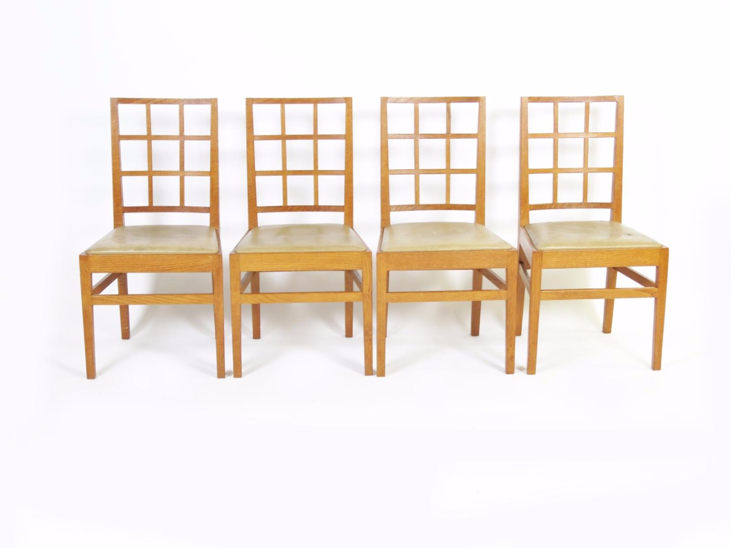 A set of six oak dining chairs the design attributed to Edward Barnsley, with lattice backs, comprising two carvers and four chairs, carvers 93cm. high (6)