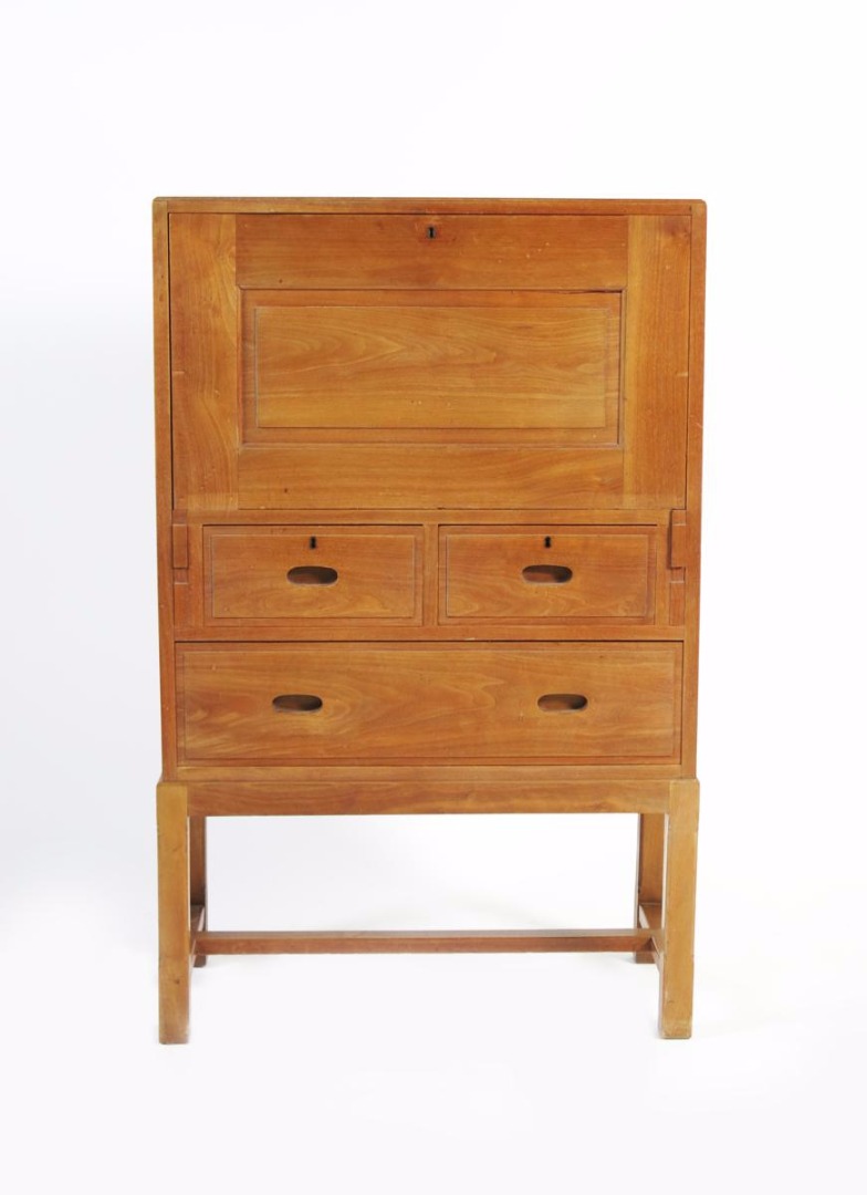 A Heal's teak student's bureau, over two short drawers and one long drawer, applied ivorine button label to drawer 119cm. high, 75cm wide, 36.5cm deep
