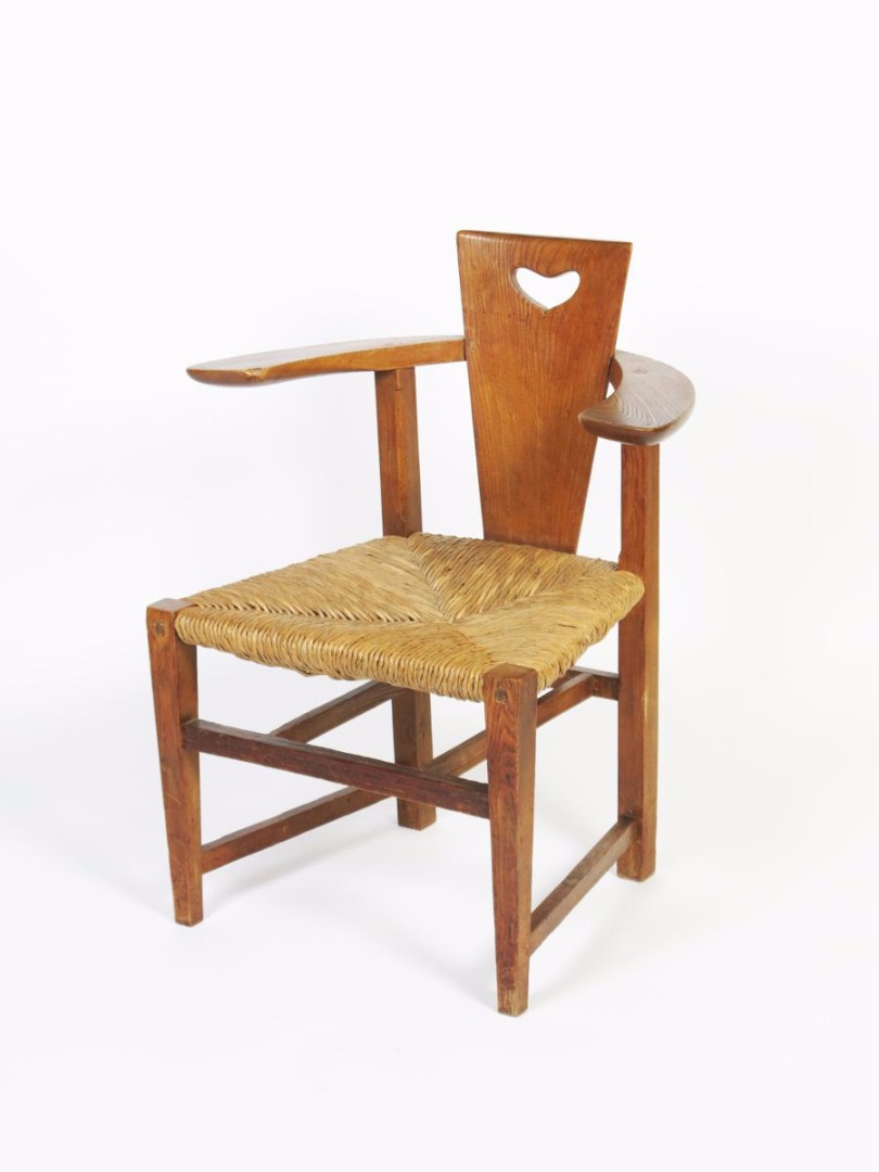 An oak Abingwood chair designed by George Walton, solid upright back with heart-shape cut out, wide sweeping arms, rush seat, 82cm. high.