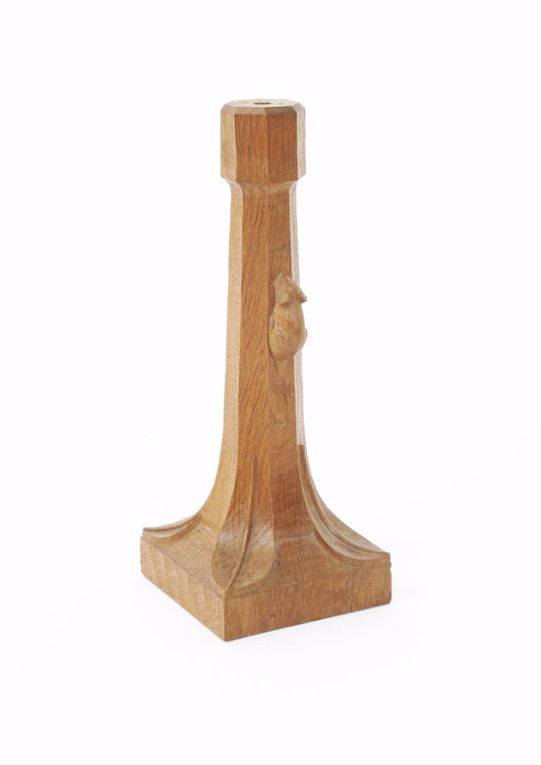 A Robert Mouseman Thompson oak table lamp, the tapering stem with carved foliate motif, carved mouse signature 25.5cm. high