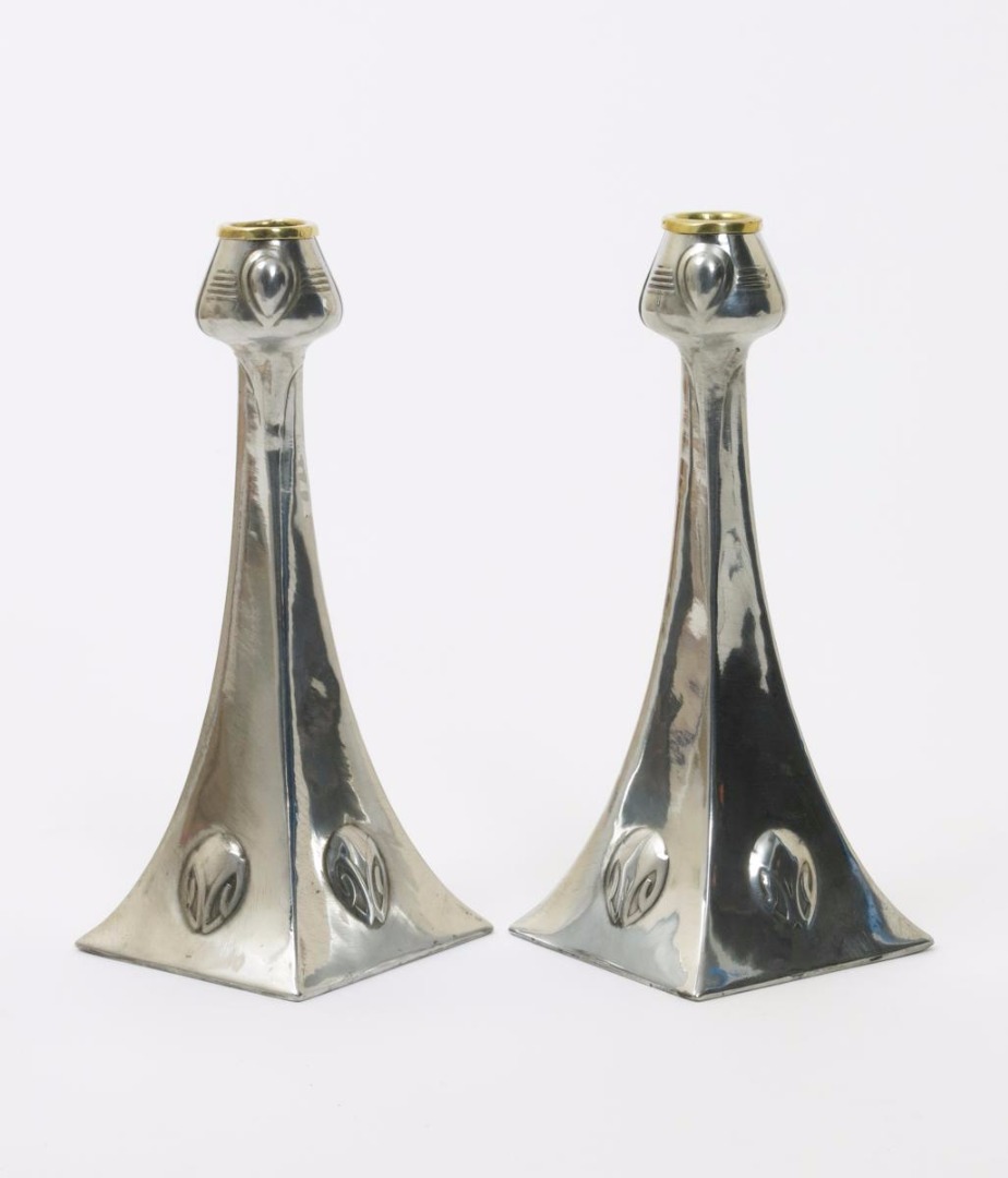 A pair of WMF Secessionist pewter candlesticks designed by Albin Muller