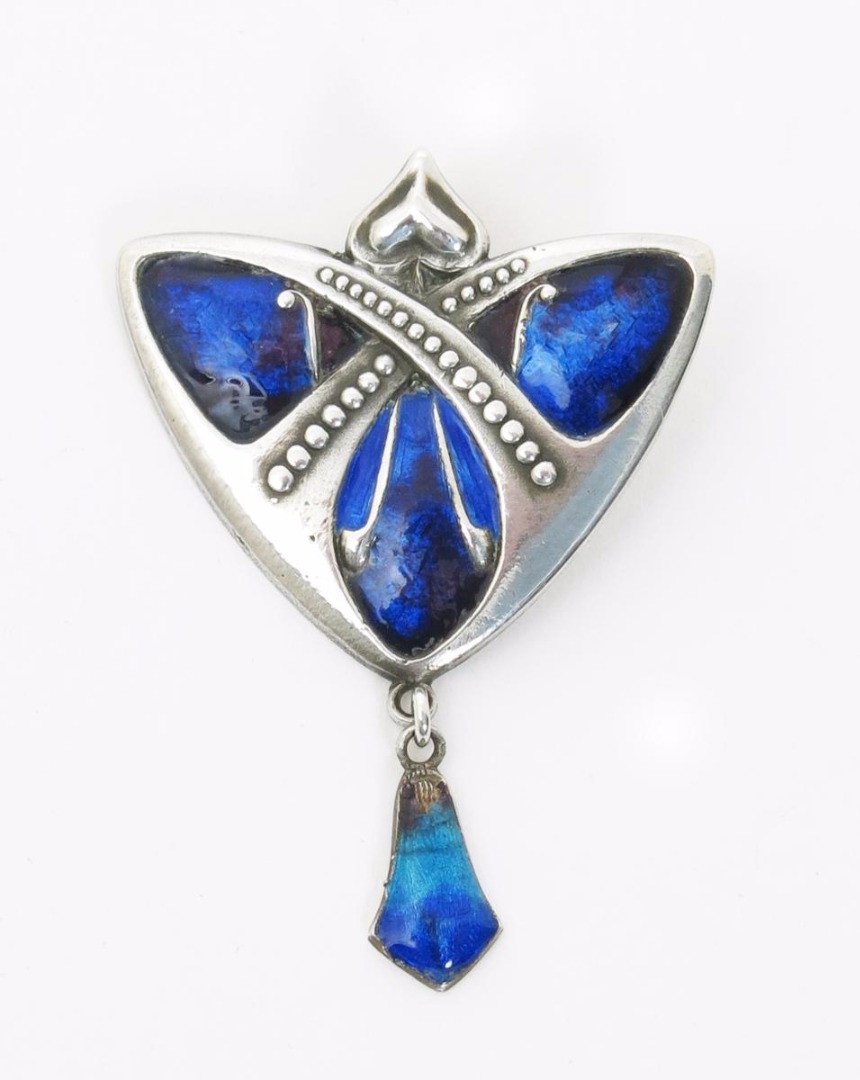 A Queensway silver and enamel Secessionist pendant, triangular form, cast in low relief with whiplash foliage stems and small heart-shaped foliate bud, enamelled blue, and a small drop with graduated blue enamel, stamped Queensway Sterling Silver, 4cm. long