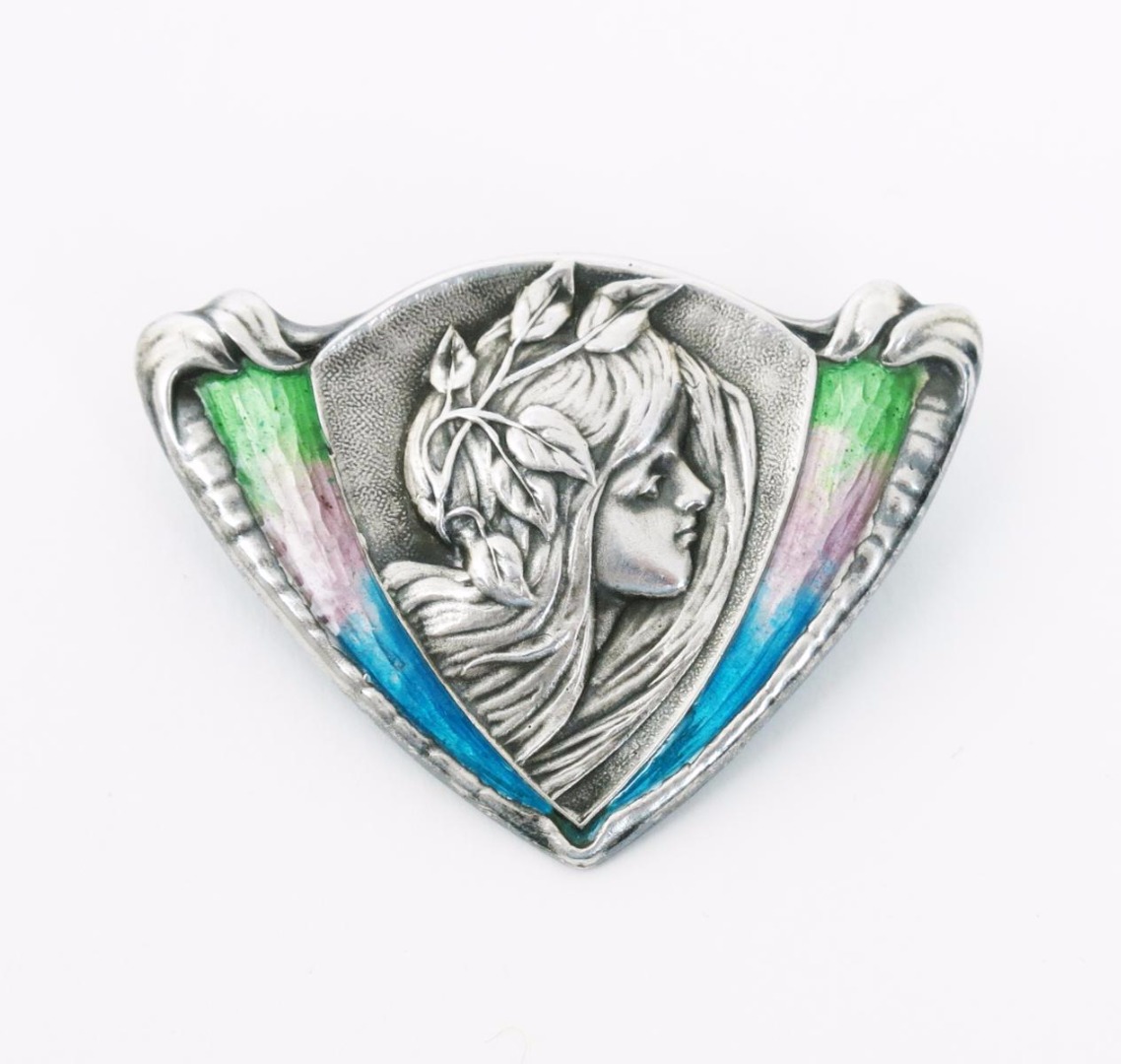 An Art Nouveau Queensway silver and enamel brooch, cast in low relief with a central Art Nouveau maiden in shield shaped panel, flanked by foliate border, enamelled green, pink and blue, stamped Sterling Silver to reverse, 3.5cm. wide