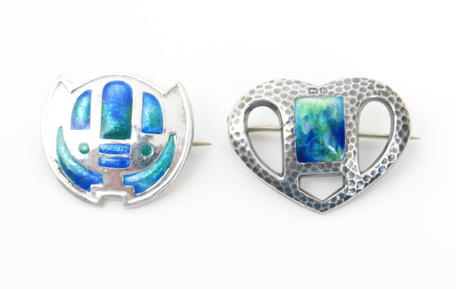 A Charles Horner silver and enamel Secessionist brooch, cast in low relief and enamelled in shades of blue and green, and a Gourdel Vales & Co silver and enamel brooch stamped marks, Horner Chester 1909, Gourdel Birmingham 1907, 2cm. wide (2)