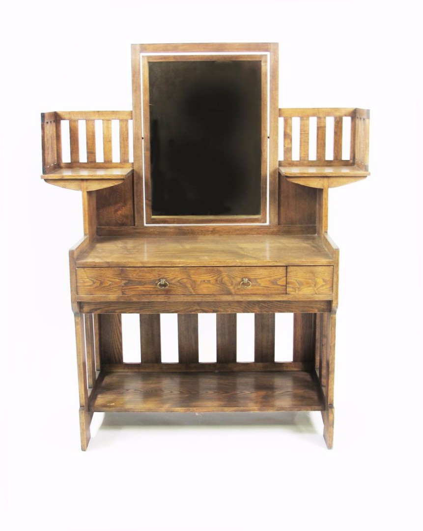 A Liberty & Co oak dressing table designed by Leonard Wyburd, the shelved slat-back with rectangular mirror, above central drawer and slat-back open shelf to base, patinated metal furniture, label missing, 127cm. wide, 154cm. high